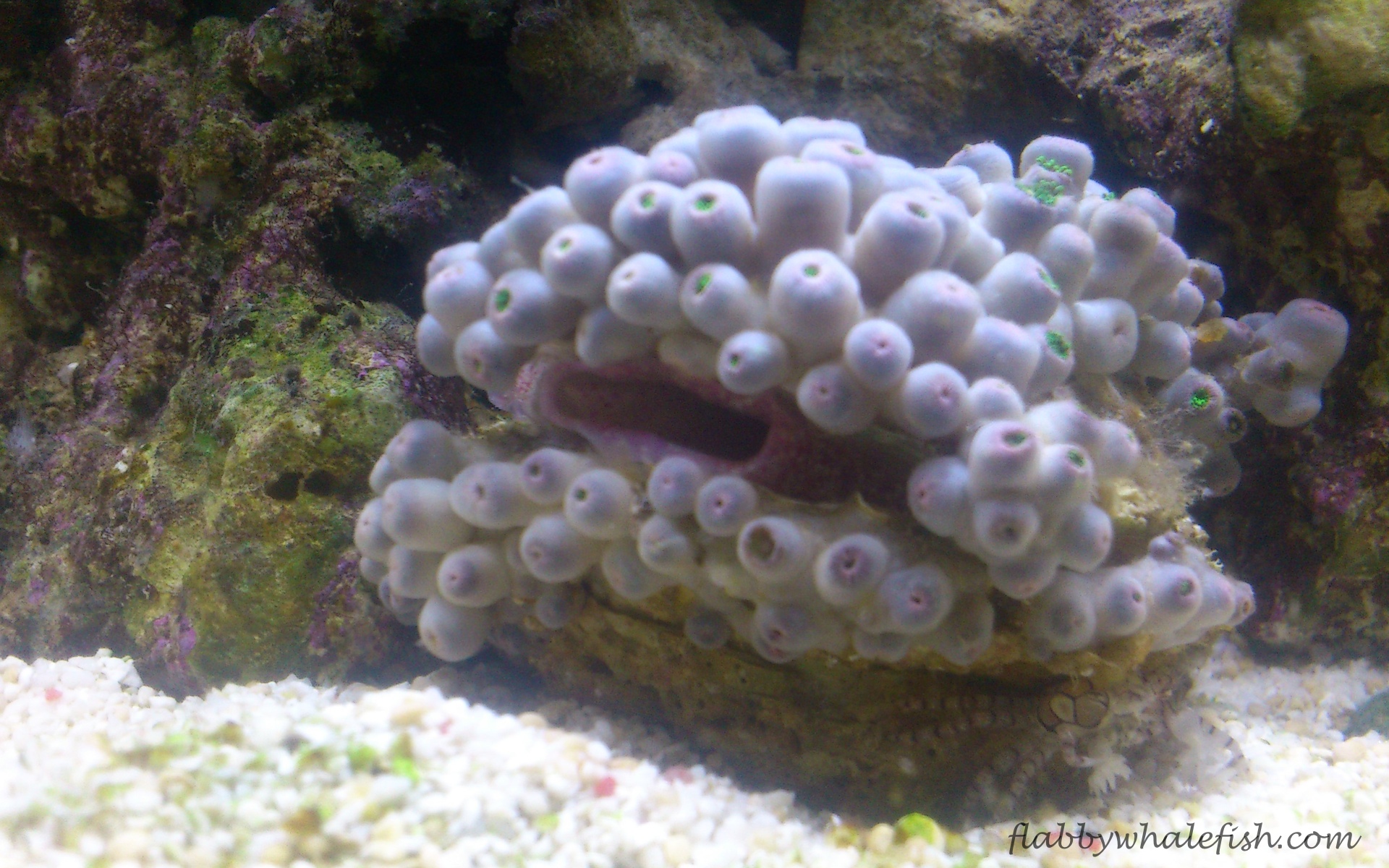 After a few weeks I decided that my clean up crew wasn’t nearly gastropody enough (surely that’s an adjective!). I decided to go online in my search for stock this time, ordering in 2 cerith and 2 nassarius snails for the tank. I also took the opportunity to get some mushroom frags from the wholesaler as they seemed to be quite cheap. The tank progressed steadily from there. More corals were slowly added, green star polyps satisfied my need for some movement and vibrant colour in the tank. I naively purchased an alveopora, perhaps not the best coral for such a small tank, but you learn from these things. A duncan coral soon joined the mix, as well as various zoas and ricordea.