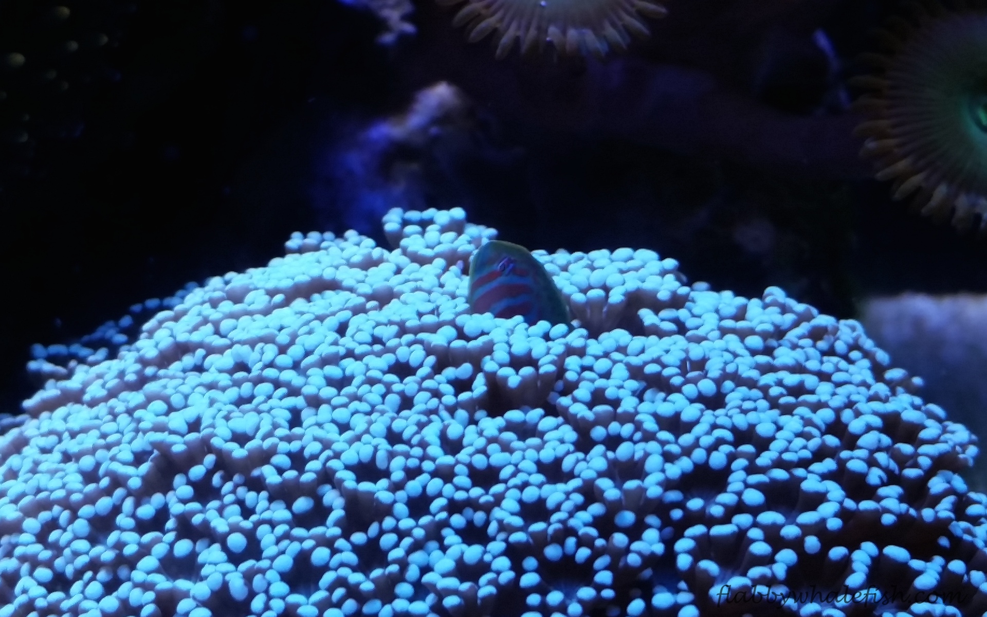 I immediately enjoyed the new tank, the TMC microhabitat was acrylic, and I had inevitably covered it in scratches. The aquanano is glass on the other hand, so should withstand my clumsiness a bit better. The transfer was straight forward, and although only an increase in volume of 7 litres was had, I was very excited about the prospect of all the extra space I had. I promptly filled the extra space with corals and rocks, more zoas and a hammer coral joined the fray. I built a hood from Perspex for this tank, as the glass cover that came with was fiddly and not very user friendly. With that in place I decided to get another fish, this time going for a green coral goby. Although not as out going and interactive as the yellow clown goby, the green goby is undoubtedly beautiful, it has taken up residence in the alveopora. I like to think of it as a clownfish and anemone type of symbiosis, although quite what the alveopora gets out of having a goby wriggle around its polyps is anyone’s guess.