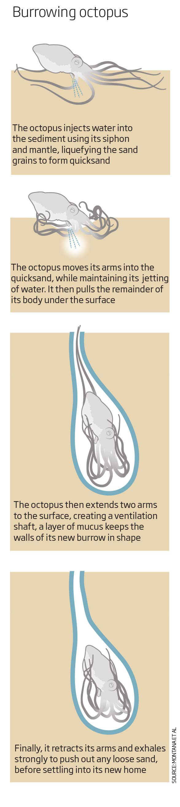 The sand octopus however, actually creates of subsurface burrow by digging deeper, using its jet and arms to submerge itself below the sand. “This is the first known cephalopod to burrow,” says Jasper Montana of the University of Melbourne.